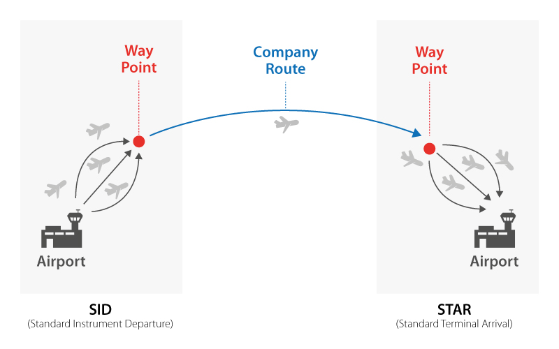 항공기가 활주로에서부터 출발할 때, 표준 계기 출항 절차 (Standard Instrument Departure, SID)가 지정됩니다. 항공기가 항공사 경로의 첫 번째 웨이포인트(waypoint)에 도달하기 위해서 거쳐야 하는 지점을 알려줍니다.