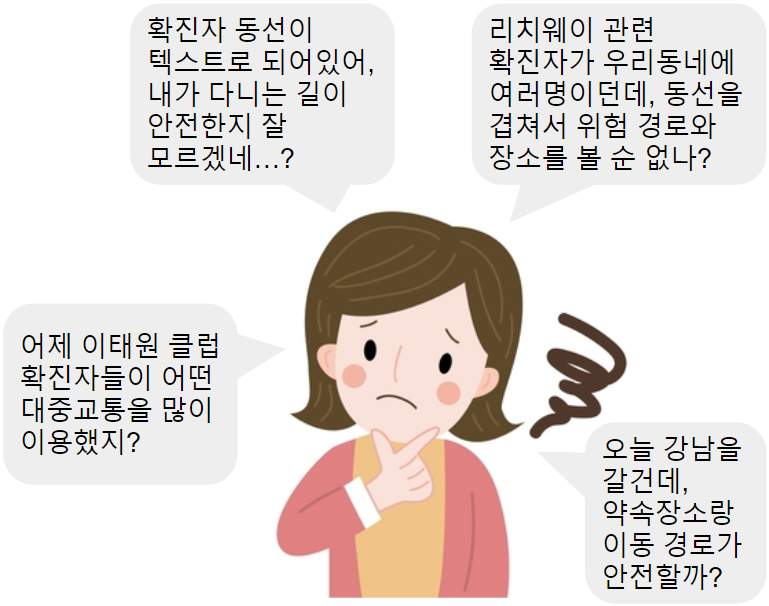 그러나 찬사 일색인 ‘확진자 동선 추적’ 시스템을 자세히 살펴보면, 아직 개선해야 할 여지는 많습니다. 특히 텍스트를 기반으로 이동 동선을 안내하는 방식은 그 한계가 뚜렷하다는 지적이 꾸준히 제기되어 왔습니다. 데이터를 한눈에 알아볼 수 있도록 시각적으로 표현하는 ‘데이터 시각화’라는 부분이 결여되어 있기 때문에, 확진자의 이동 동선 및 해당 지역의 방역 현황을 직관적으로 파악하기 어렵습니다.