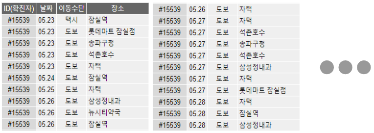사실 위 [그림1]과 [그림3] 두가지 모두 확진자 1명에 대한 이동 동선 데이터를 볼 경우에는 큰 어려움이 없습니다. 하지만, 코로나 확진은 1명이 아닌 누적 13,879명(2020/7/22 기준)에 대한 이동 동선을 살펴봐야만 그 의미가 있습니다. 그래야 위험지대, 안전지대, 장소에 대한 구분과 이태원 클럽 등 특정 상황에서의 전파 상태 등을 인지할 수 있기 때문입니다.