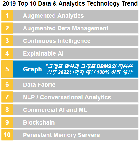 미국의 글로벌 정보기술 연구자문 기업인 가트너에서도 그래프 DB를 주목했습니다. 가트너의 도널드 페인버그 부사장은 지난 2019년, ‘Gartner Data & Analytics Summit’에서 2019년 10대 데이터 및 분석 기술 트렌드를 발표했습니다.(2) 상위 10개 기술 트렌드 중 ‘그래프’ DB 분석을 5번째로 언급했고, 2022년까지 연간 100% 이상 성장할 것으로 예상했습니다. 이처럼 글로벌 트렌드를 이끄는 이들이 주목하는 ‘그래프’ 기술의 가치에 대해 의심할 여지가 없음은 분명해 보입니다.