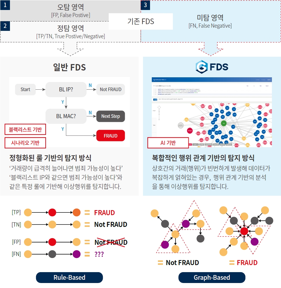 G-FDS는 기존의 FDS가 탐지하지 못하는 영역을 AI 기반의 ‘그래프’로 탐지합니다. 다음 그림을 통해 룰 기반의 탐지 방식을 가진 일반적인 FDS와 비교하고자 합니다.