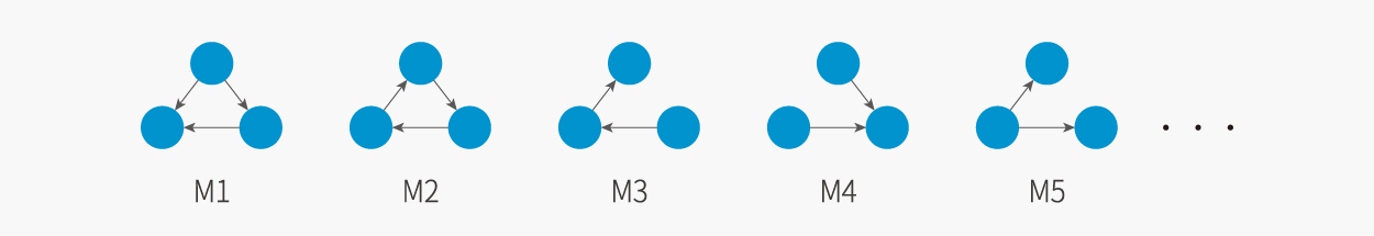 모티프(Motif)는 일정한 수의 노드(Node)로 만들어낼 수 있는 가설 패턴들(M1, M2, M3..)에 대한 정의이며, 서브그래프(Subgraph)라고도 불립니다. 예를 들어, ‘A가 B에게 이체하고, B가 C에게 이체했다’라는 하나의 가설 패턴이 모티프가 되는 것입니다.