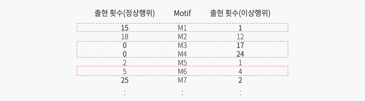 모티프 지문의 수를 수집해 이상 행위의 패턴별 빈도를 알기 위한 점수를 도출합니다. 이때 통계학적인 정규분포를 만들어 점수를 부여하게 되는데, 이를 Z 점수(표준 점수)라고 합니다. 이 Z 점수를 기반으로 이상 행위와 정상 행위에서 자주 나타나는 패턴을 나열해 그 차이를 비교하고, 그중 빈도의 차이가 큰 모티프 지문을 발견하면 이를 의심 패턴으로 지정합니다. (다만, 정상 행위 빈도수가 높고 이상 행위가 존재하지 않는 경우의 모티프라면, 의심 대상으로 지정할 수 없음). 이 의심 패턴의 데이터는 곧 범죄유형의 샘플 데이터로 볼 수 있으며, 이 데이터를 누적 시켜 향후의 이상 행위 및 범죄의 적발에 활용하게 됩니다.