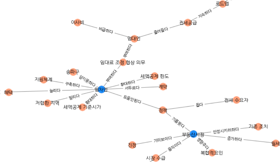 4) ‘그래프 분석기술의 적용’이 가능한 모델이다. 단어 간 유사도를 측정하여 그래프 군집기술을 사용하는 등 이미 단어 간의 관계를 그래프로 구축하였기에 다양한 그래프 분석을 활용하기 좋은 모델이다.