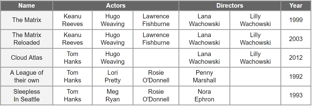 위 이미지에는 톰 행크스가 출현한 영화, 그리고 각 영화에 톰 행크스와 연기한 주연 및 조연 배우가 포함되고 있습니다. 또한 그 주연/조연 배우들이 다른 영화에 출현했다는 사실까지 알 수 있습니다.