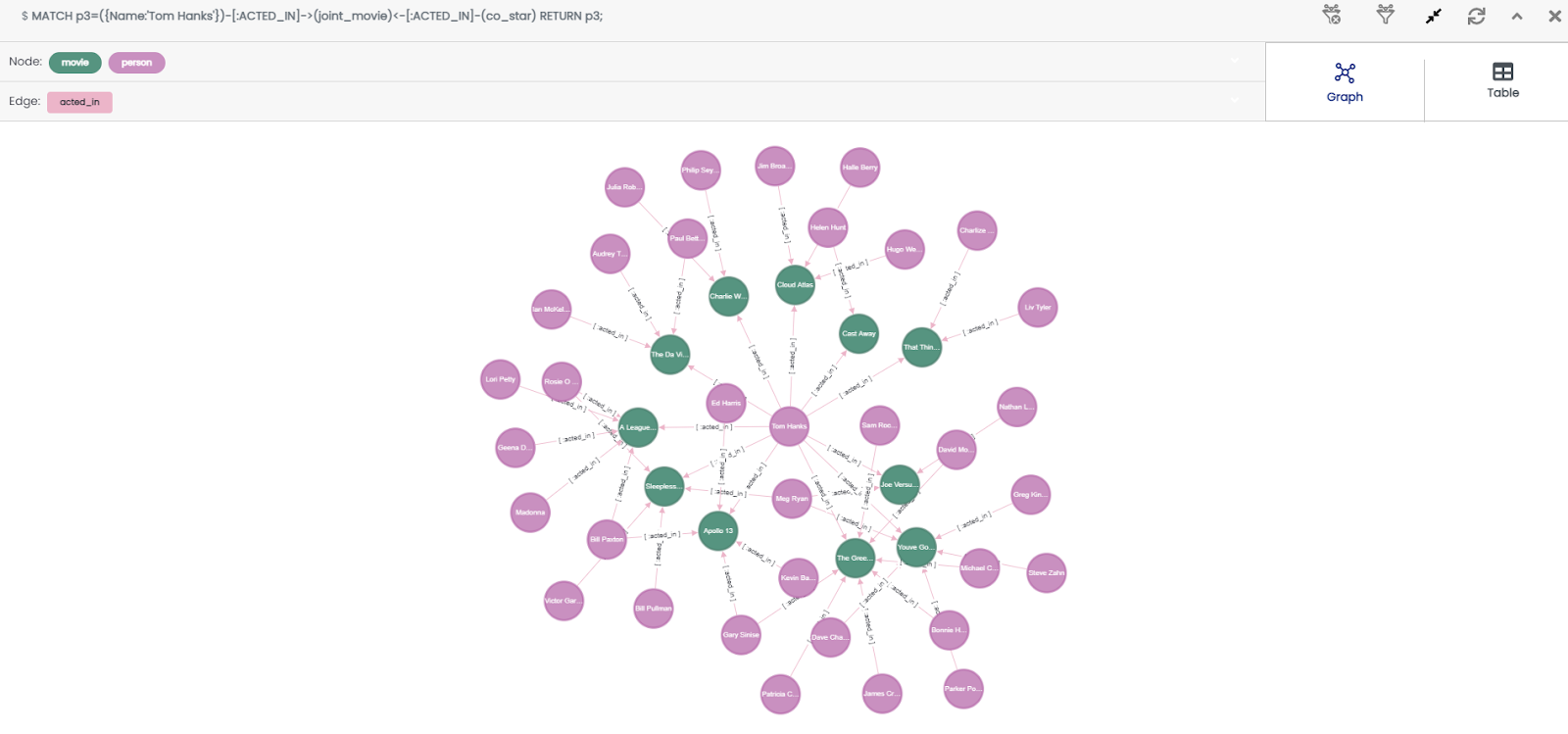 G) 공백의 Query Editor에 복사한 쿼리를 붙여놓고 오른쪽 세모 모양의 실행 버튼을 누르면 아래와 같이 ‘톰 행크스와 함께 연기한 배우들’에 대한 관계를 나열합니다.