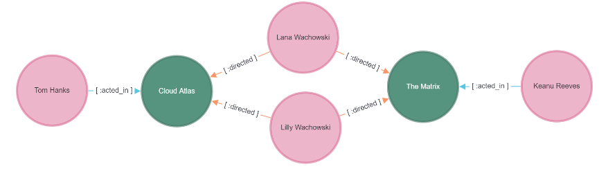 자, 조금 더 자세히 살펴보겠습니다. ‘톰 행크스가 클라우드 아틀라스라는 영화에서 출연했고, 그 영화를 워쇼스키 자매가 감독했는데, 이들은 매트릭스의 감독이기도 했고, 매트릭스에서는 키아누 리브스가 출연했다.’ 즉, 워쇼스키 자매가 이 둘의 관계를 이어주는 연결고리라는 것을 알 수 있습니다.