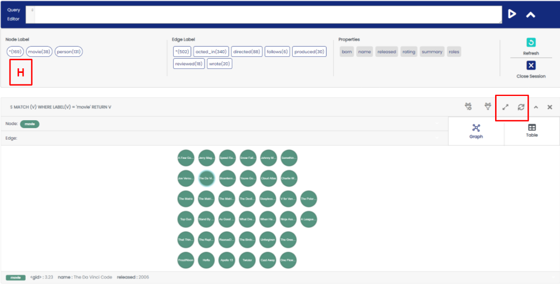 H) 노드 레이블은 영화와 사람을 포함합니다. 엣지 레이블은 행동을 보여주는데, ‘acted in’, ‘directed’ 등을 보면 이 사람이 영화와 어떤 관계를 맺고 있는지 파악할 수 있습니다. Properties는 각 노드의 특징을 보여주는데, 출생연도, 이름, 영화 출시연도를 확인할 수 있습니다. 각각 노드와 엣지, 그리고 프로퍼티를 눌러서 영화와 배우 및 감독들의 연결점을 직접 찾아보세요!