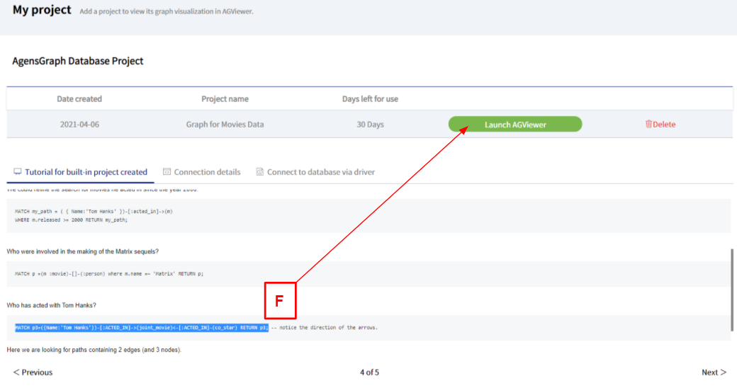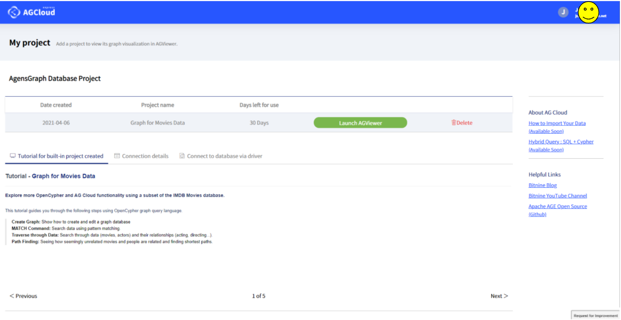 프로젝트를 시작하면 영화 데이터에 대한 튜토리얼이 제공됩니다. 튜토리얼을 통해 Cypher 쿼리 언어와 AG Cloud 기능에 대한 소개를 숙지하세요. 영화 데이터에 관계를 찾는 쿼리가 여럿 소개됩니다.