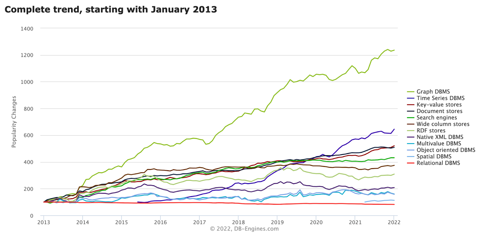 NoSQL DB들 중 가장 주목받는 것은 그래프 DB입니다. 관계형 DB를 포함해 다양한 DB들 중 압도적인 성장세를 보이며 시장을 확대해 나가며 미래 가치를 인정받고 있습니다. 글로벌 No.1 시장조사기관인 가트너(Gartner)가 오는 2025년까지 전 세계 기업의 80%가 그래프 DB를 활용할 것이라고 예측할 정도로 트렌드의 중심에 자리 잡고 있습니다.