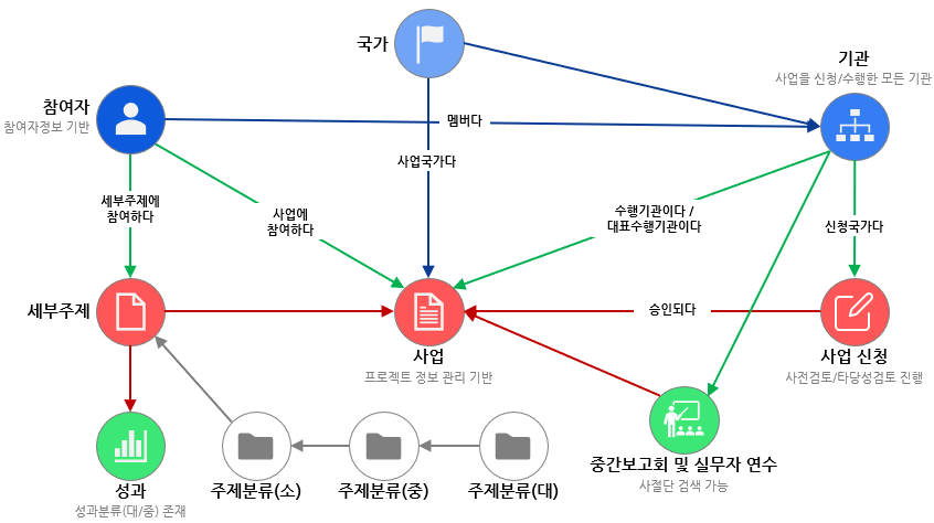 경제발전경험 공유사업은 사업 발굴에서 성과 관리에 이르는 일련의 life cycle에 따라 체계적으로 진행되고 있었으나, 그래프 DB를 적용하기 전까지 개발협력 사업에 대한 정보는 파편화된 엑셀 테이블 단위로 관리되고 있었다. 각 테이블 데이터 간 연계성이 부족하여 다양한 요소 간의 관계 파악 및 사업 분야별, 단계별 매칭이 어려웠고, 참여 기관, 전문가 등 사업정보 변경에 따른 테이블 및 애플리케이션 유지와 관리에 큰 비용과 많은 시간이 소모됐었다. 또한, 기존의 테이블 간 연계를 시도할 때 데이터의 관계(path)가 깊을수록 수 없이 반복되는 join 연산에 의한 성능 문제가 발생해서 개발 협력 데이터를 효과적으로 활용하는 데 필요한 심층 질의에 한계가 있었다.