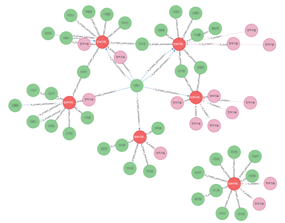 아래 KDI에서 그래프 DB 시나리오 기반 데모를 통해 조회했던 질의문을 설명하고 결과를 그래프 모델로 나타냈습니다. 시나리오에서 언급되는 전문가의 이름들은 개인정보를 보호하기 위해 blur 처리를 했습니다.