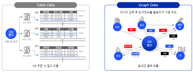 이를테면, 데이터 기반의 펀드 관리에서 일반적인 표로 펀드를 관리하면 수익률로 나타나는 현상과 수익률에 영향을 미치는 원인의 관계가 명확하게 표현되지 않아 수익률 증대를 위한 데이터 분석 및 의사결정 과정이 복잡해진다. 반면, 그래프 데이터로 관리하는 경우 관계(relationship) 속에서 현상을 직관적으로 바라볼 수 있어 현상에 대한 원인 추론이 가능하고, 향후 의사결정을 위한 데이터 분석 및 예측을 쉽게 할 수 있다. 데이터의 용량이 커지고 연결이 많아질수록 데이터를 활용하여 쉽게 볼 수 있는 방법을 찾게 된다. 데이터를 직관적으로 볼 수 있어야 데이터 분석에 적합하다고 볼 수 있기 때문이다.
