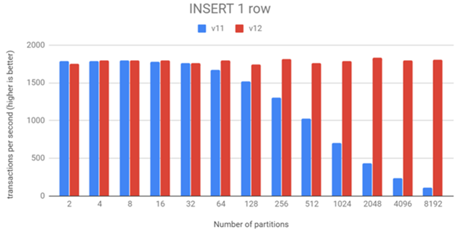 PostgreSQL 12는 초당 트랜잭션 수가 파티션 테이블 개수에 상관없이 일정한 반면, PostgreSQL 11은 파티션 테이블이 많아짐에 따라 낮아지고 있습니다. 이 그림은 초당 트랜잭션이 높은 것이 좋음을 의미합니다.