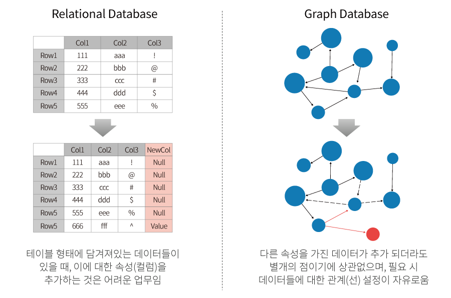 테이블 데이터에 새로운 속성을 가진 값을 추가하고자 할 때 관계형 데이터베이스에서는 칼럼 추가, 외래 키 연동, 대상 테이블에 대한 칼럼 및 제약 조건 추가 작업 등 복잡한 단계를 거쳐야 하는 반면, 그래프 DB는 새로운 속성 값을 가진 노드를 추가해 주고, 새롭게 입력된 데이터를 다른 데이터들과 선으로 연결해 주는 것만으로 작업을 끝낼 수 있습니다.
