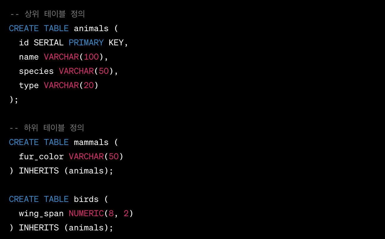 - SELECT 문 확장: 상속된 테이블의 데이터는 자동으로 상위 테이블에도 포함됩니다. 따라서 SELECT 문을 실행할 때, 상위 테이블을 대상으로 하더라도 하위 테이블의 데이터도 함께 반환됩니다.
