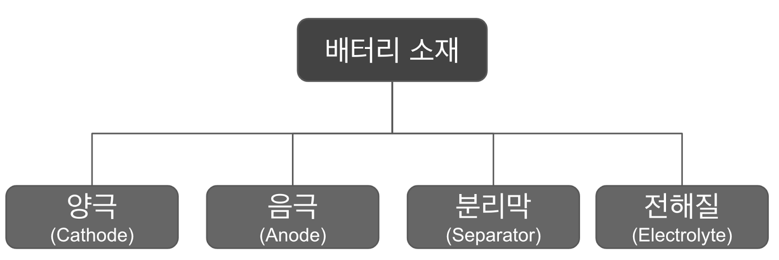 배터리의 중요 4가지 소재에는 양극재, 음극재, 분리막, 전해질 로 구성됩니다.