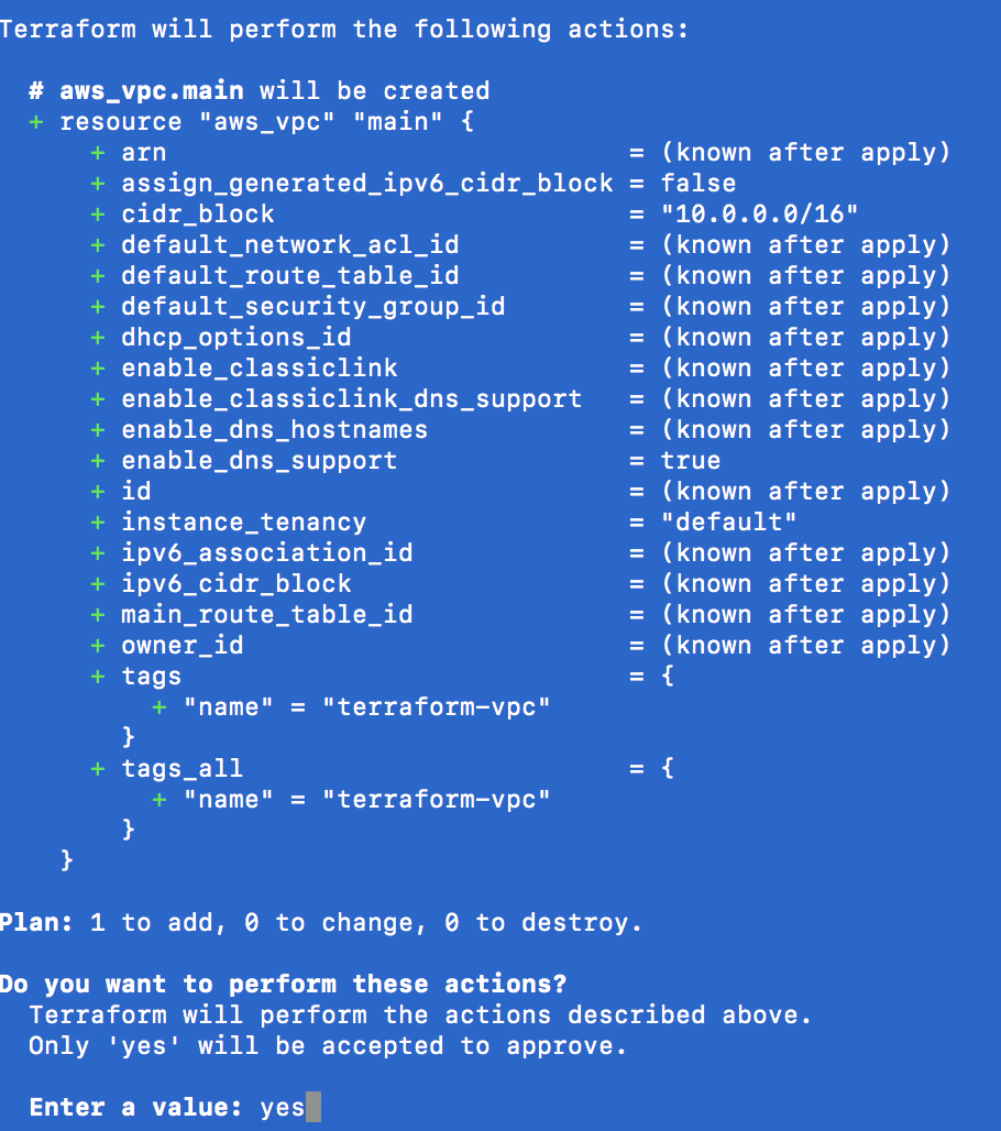 - Plan : .tf 파일의 내용이 실제 적용이 가능한지 확인하는 작업으로, create, update, delete 등의 작업이 Resource에 어떤 영향을 미칠지 보여줍니다.