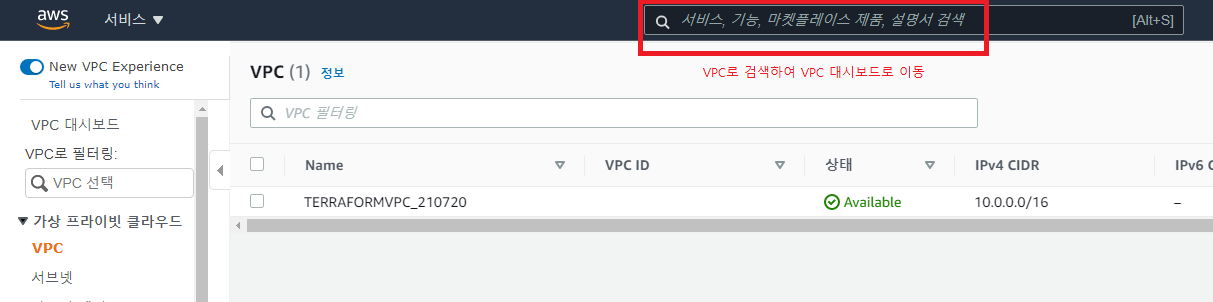생성 완료 시 AWS의 VPC 대시보드에서 상기 스크립트로 VPC가 생성되었음을