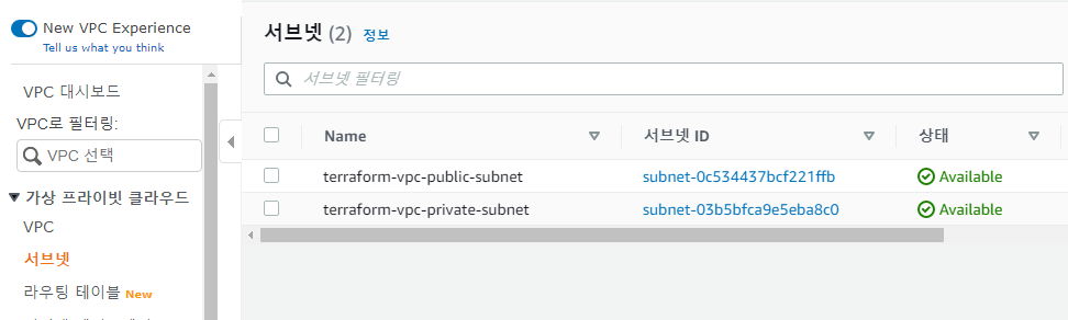 설정이 제대로 되었다면, terraform plan → terraform apply 후 VPC dashboard에서 정상적으로 생성됨을 확인할 수 있습니다.