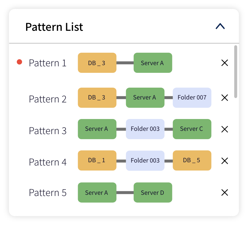 - 패턴 내역 페이지에서 저장된 패턴이 어느 DB 및 서버와 연결되어 있는지를 ‘Data Lineage’ 형태로 모든 관계를 한눈에 파악할 수 있습니다.