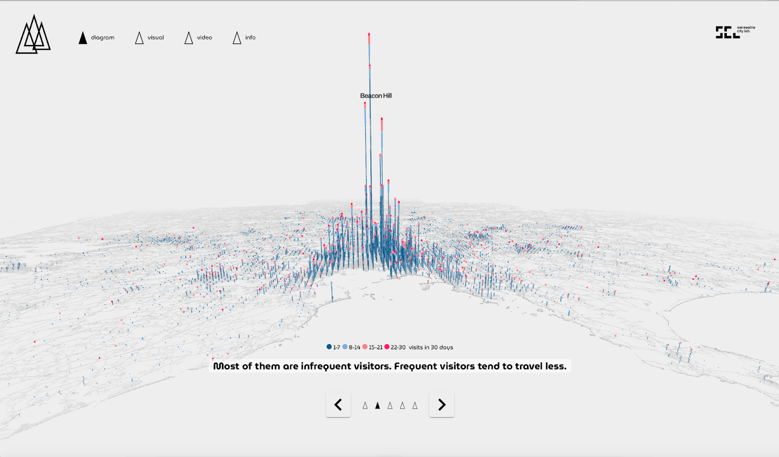위의 3D 그래프는 각 도시별로 사람들이 장소에 따라 방문한 데이터를 수집하여 시각화한 그래프입니다. 어느 지역이 가장 방문 횟수가 높고 어느 곳이 가장 붐비는 곳인지 쉽게 파악할 수 있고, 마우스 휠을 움직이면 다양한 각도에서 데이터 결과를 입체적으로 파악할 수 있습니다. 방문횟수가 높으면 높을수록 노드의 색상은 붉은색으로 표시됩니다.