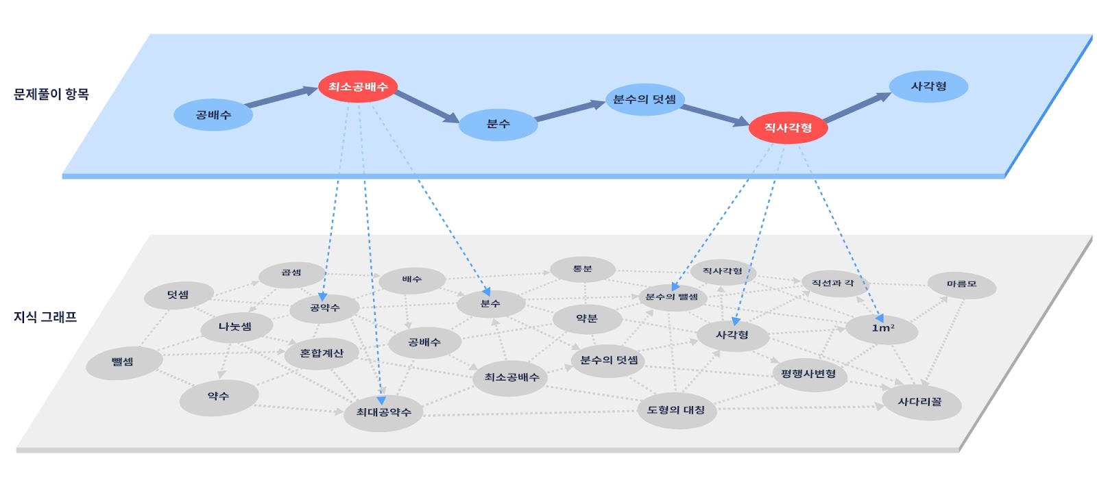 위에 보이는 그림과 같이, 수학 학습 체계를 그래프 모델링하여 교과목, 영역, 단원, 개념단위, 문항 등의 여러 지식 단위를 서로 연결된 그래프로 표현하였습니다.