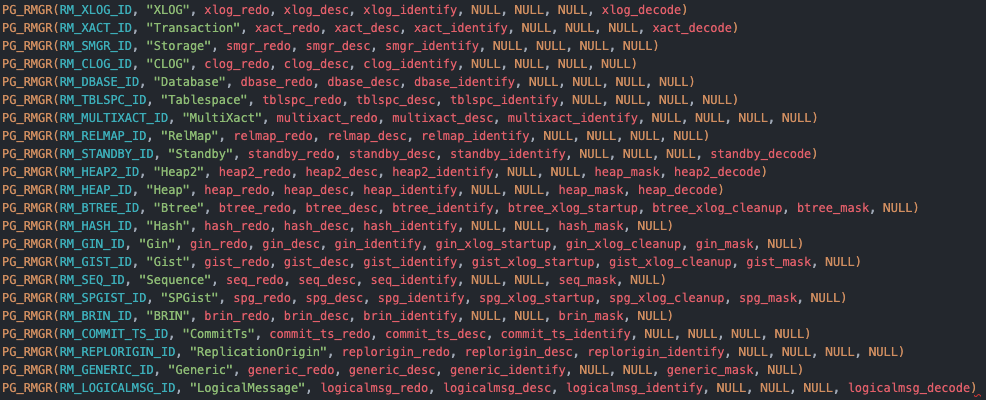 pg에 등록되어 있는 빌트인 리소스 매니저들 목록. 다양한 리소스들에 대한 기능이 함수 포인터로 참조 및 선언되어 있습니다.
