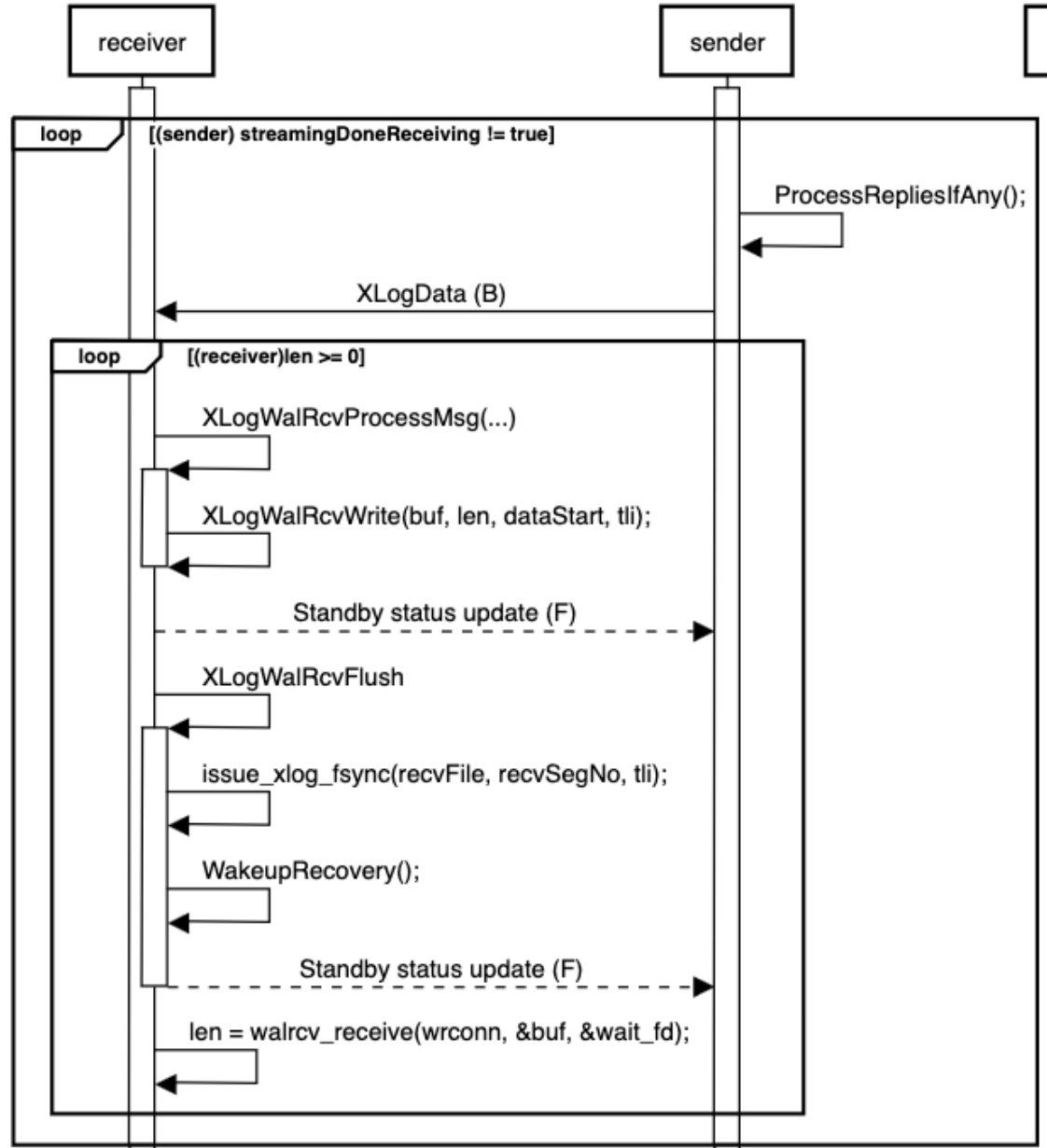 - sender에서 실제 XLog 데이터를 메시지를 통해 전송(XLogData(B))합니다.