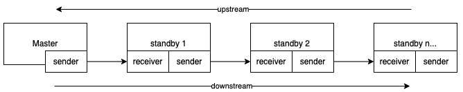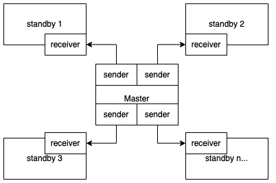 물리적 복제를 구현하는 핵심은 Primary에서 수행하는 WAL³ 파일의 전달과, Standby에서 수행하는 WAL Replay입니다. WAL파일의 전달은 마스터-스탠바이 간 프로토콜⁴ 메세지 교환을 통해 이루어집니다.