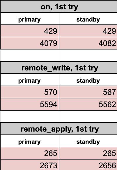 Master노드에서 디스크에 저장되었지만 standby노드에 전달되지 못한 WAL 로그만큼의 데이터 손실이 발생한 것을 알 수 있습니다. synchronous_commit 옵션을 변경하면서까지 테스트를 해보았지만 네트워크를 통해 전송되지 못한 데이터만큼의 차이가 발생하였습니다.