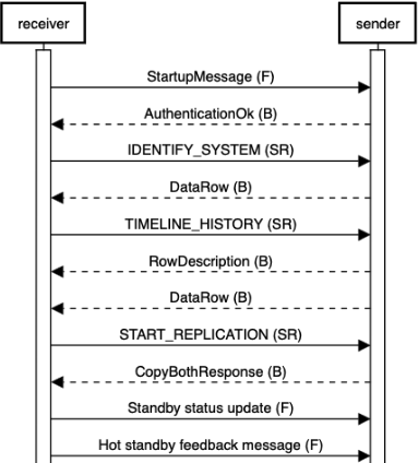 - 클라이언트의 START_REPLICATION 쿼리 전송시 서버에서는 CopyBothResponse (B) 메시지를 통해 응답하며 서버의 COPY 모드가 활성화됩니다.