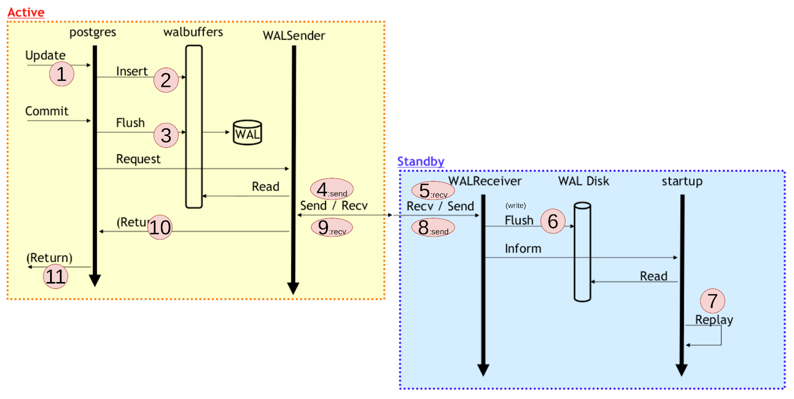 쿼리가 실행되는 master에서의 wal 데이터가 전달되어 standby에서의 wal 데이터가 replay를 완료하였을 때 master의 커밋을 완료합니다. 그림의 7번 작업이 완료되었을 때에 해당됩니다.