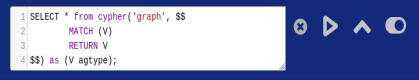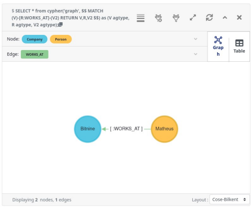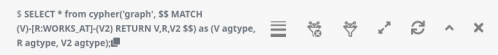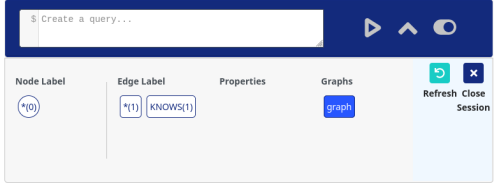Edge Label : This section displays all the available edges within the current selected graph. When clicking in the (*) symbol, it will generate a query in the text box of the Query Editor that, when executed, will show all the available connections stored in the graph in the Viewer Panel. In a graph with other edge labels, when clicked on one of those, it will generate a query to fetch connections with only that label.