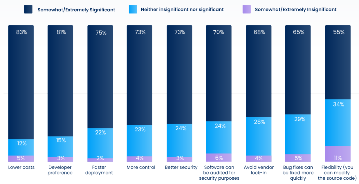 오픈소스 DBMS 전문 지원 업체 퍼코나(Percona)가 조사한 설문 결과에 따르면 오픈소스를 선택하는 이유에 대해 설문조사를 진행했을 때 ‘비용 절감’ 때문이라는 응답이 가장 많았으며, 그다음 개발자 선호도 및 신속한 배포를 도입 이유로 꼽았습니다. 다른 어떤 부분보다 빠른 변화에 적응하는 강점을 보이는 만큼, 클라우드 전환 트렌드와 밀접하게 연관되어 있음을 파악해 볼 수 있습니다.